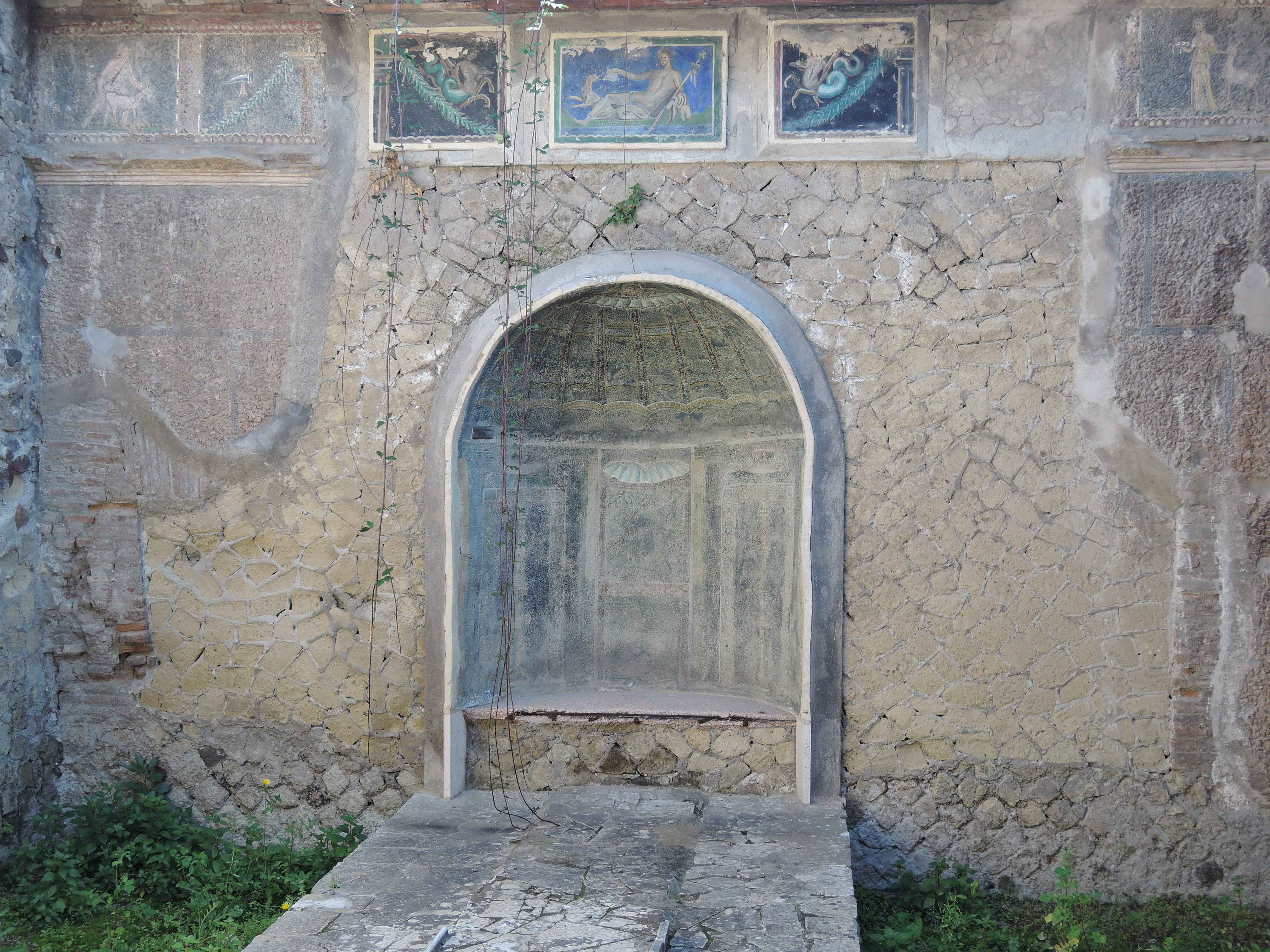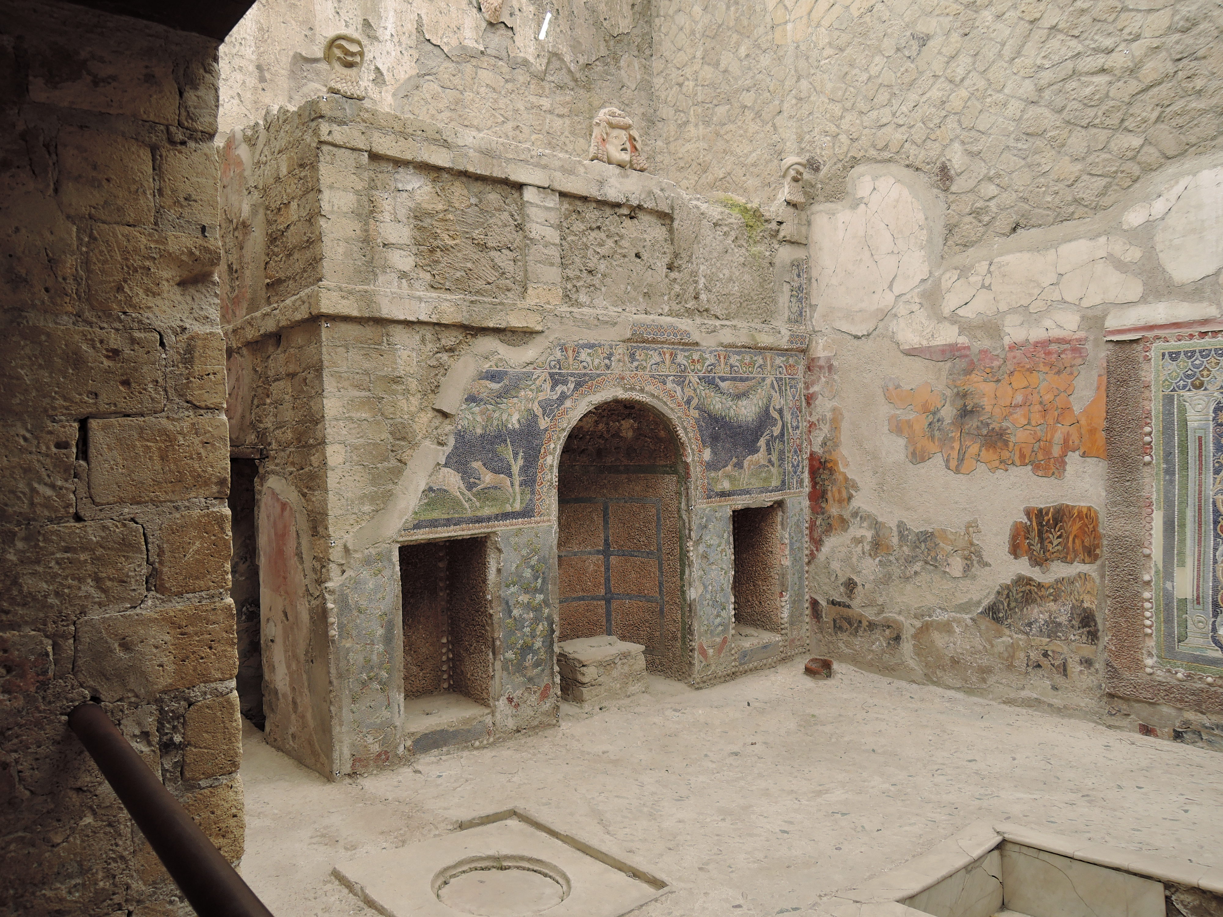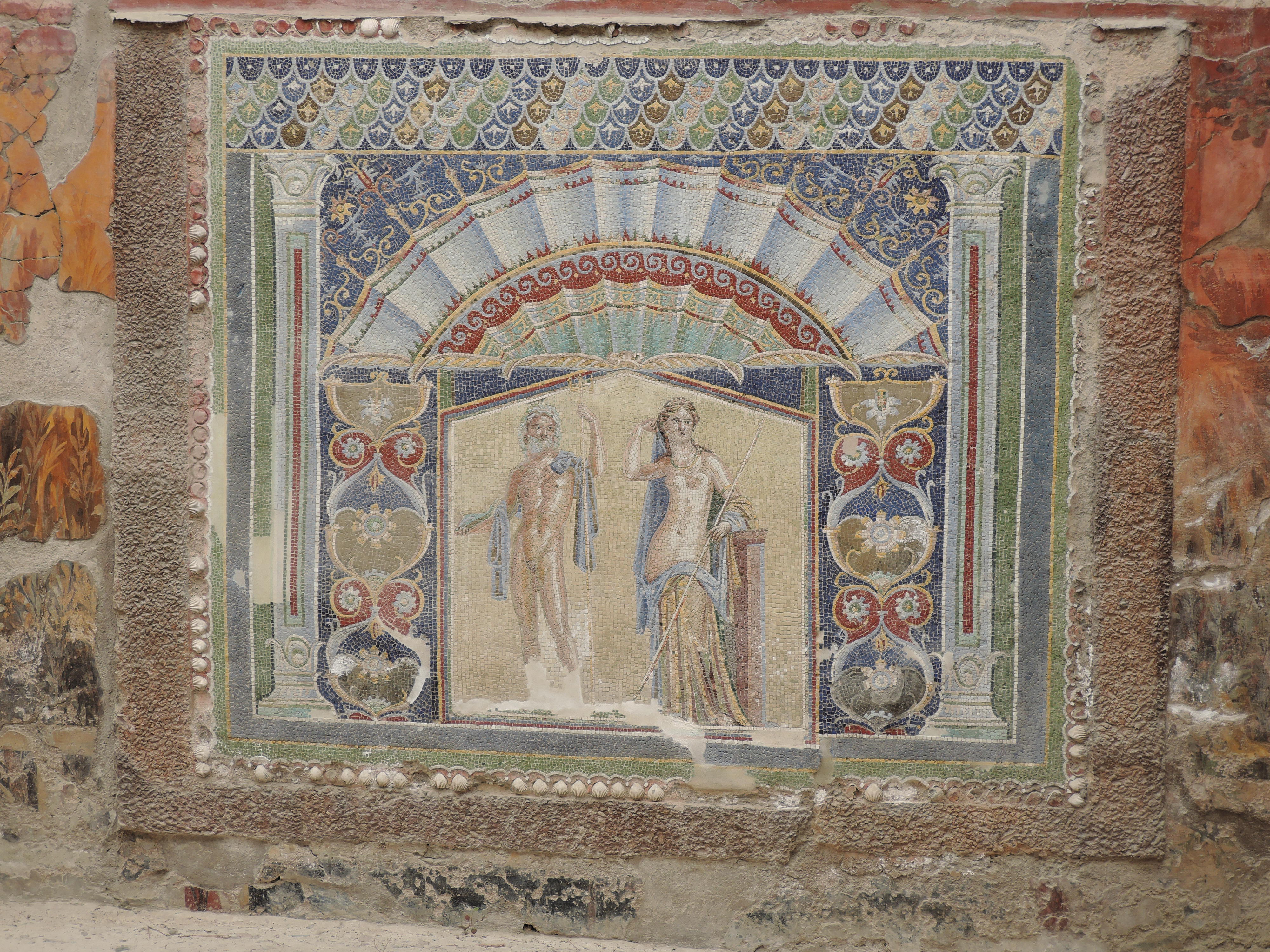 Die nächste Station waren dann das Grabungsgelände von Herculaneum (Savi di Ercolano). Als der Vesuv im Jahre 79 n. Chr. ausbrach, bedeckte die Lava das am Berg gelegene Dorf. Durch Ausgrabungen wurden Teile wieder freigelegt, die durch die Zuschüttung erstaunlich gut erhalten sind. Die antiken Räumlichkeiten, von Wohnhäusern, Thermen und Verkaufsläden bis zu Priesterstätten, konnten wir tatsächlich wiedererkennen. Viele Einzeilheiten, wie Mosaikböden und Wandfresken, haben die Zeit überdauert. Vor allem ein Mosaik von Neptun und Amphitrite und ein Relief von Thelephos haben fast keinen Schaden genommen.