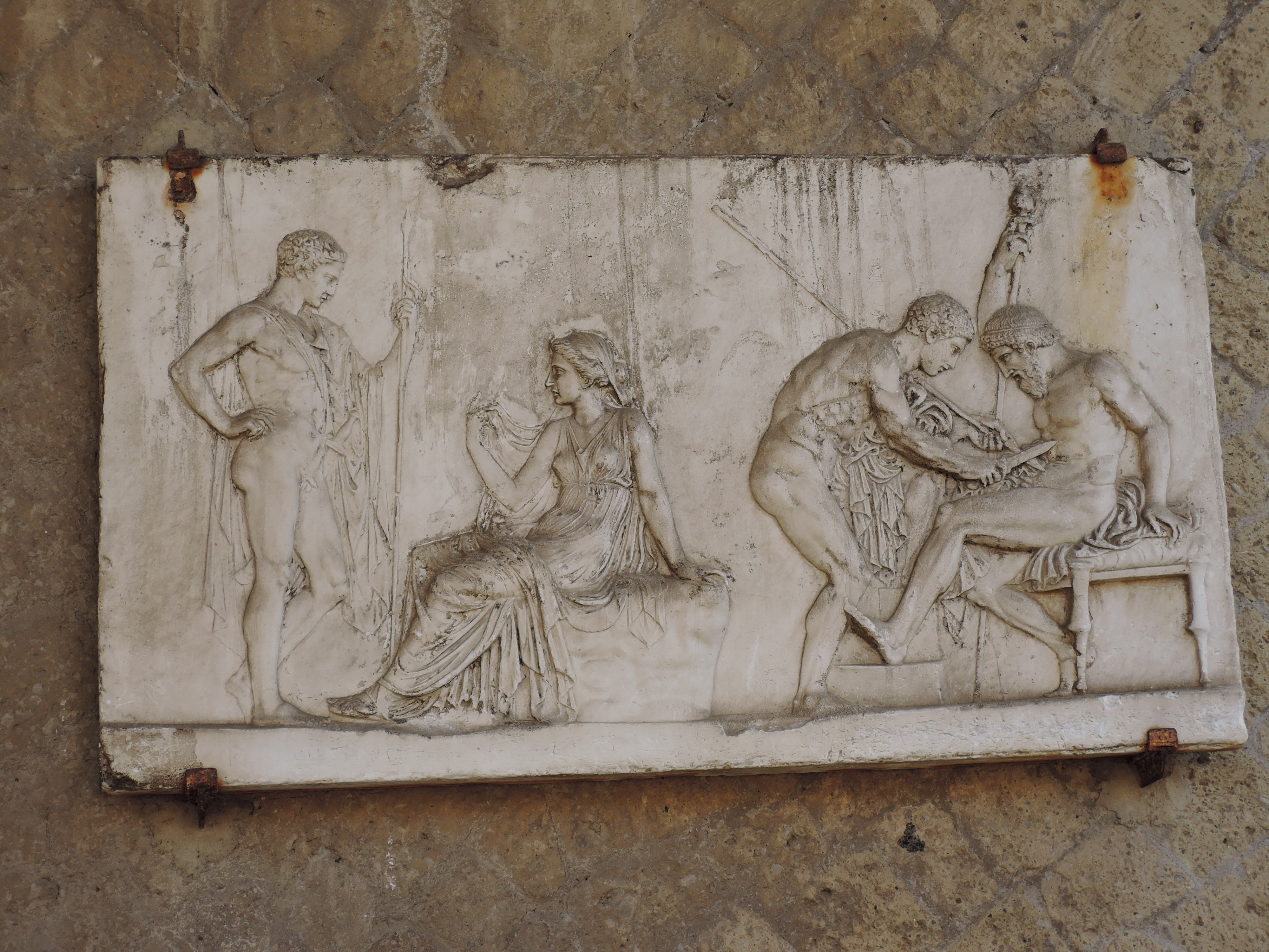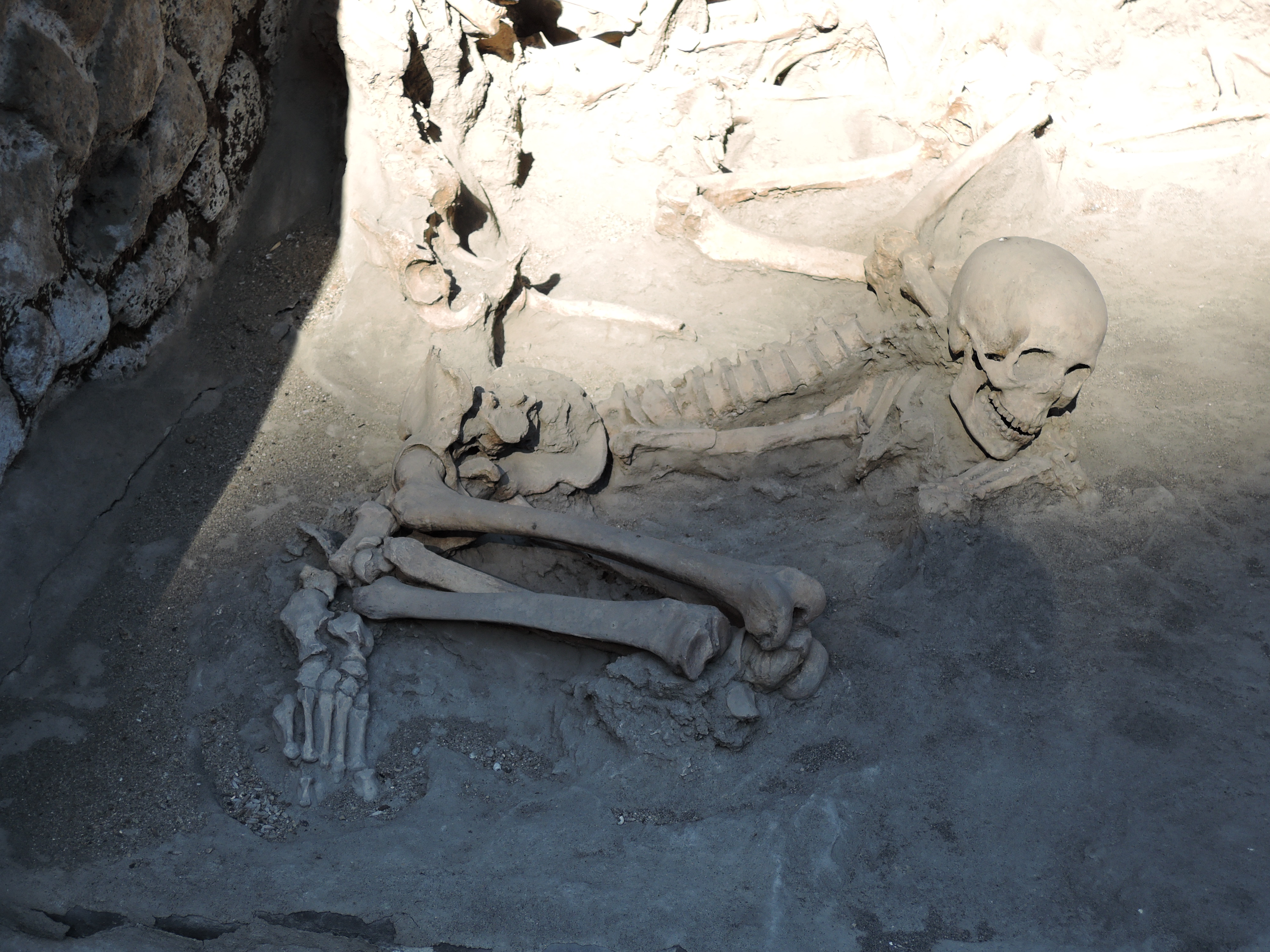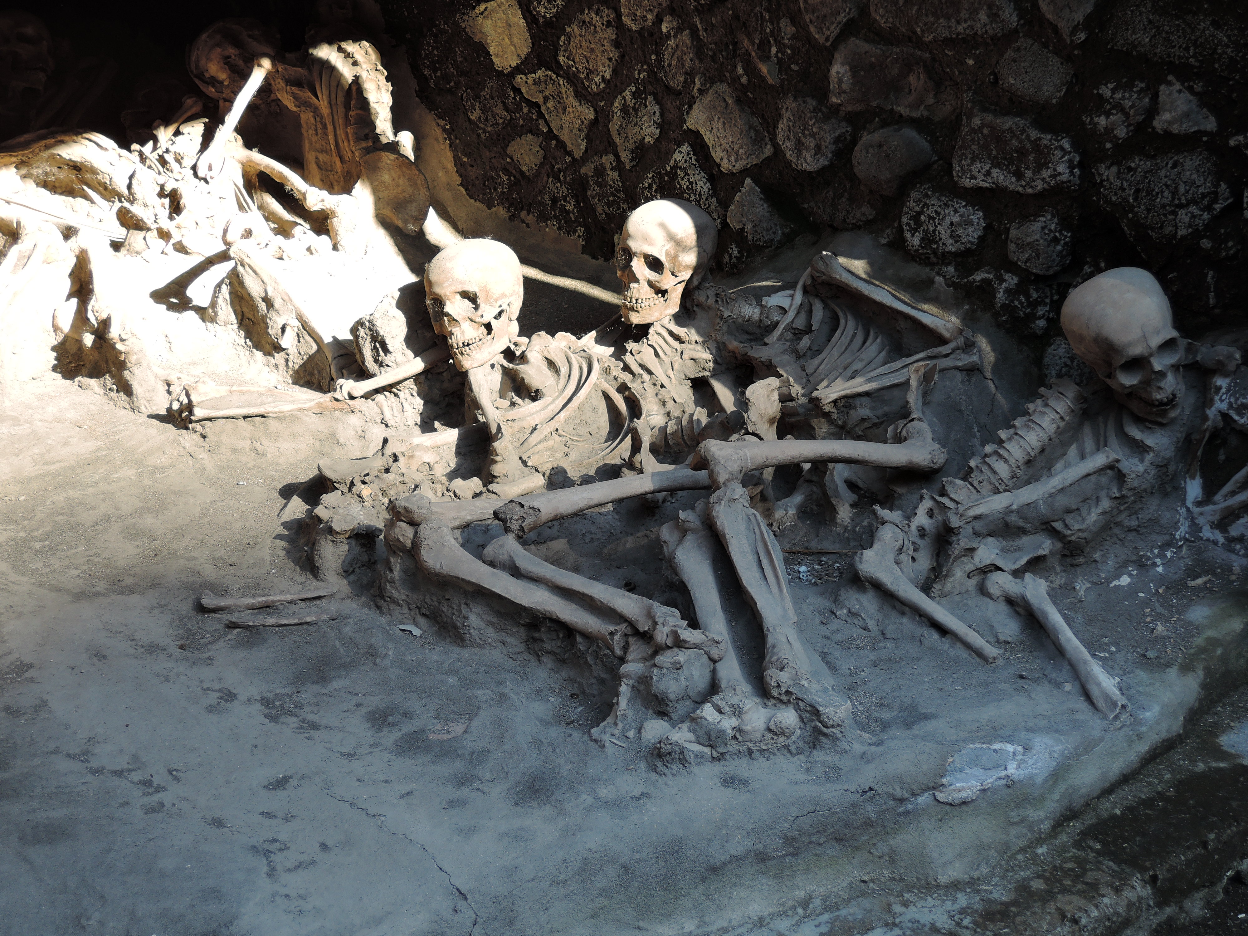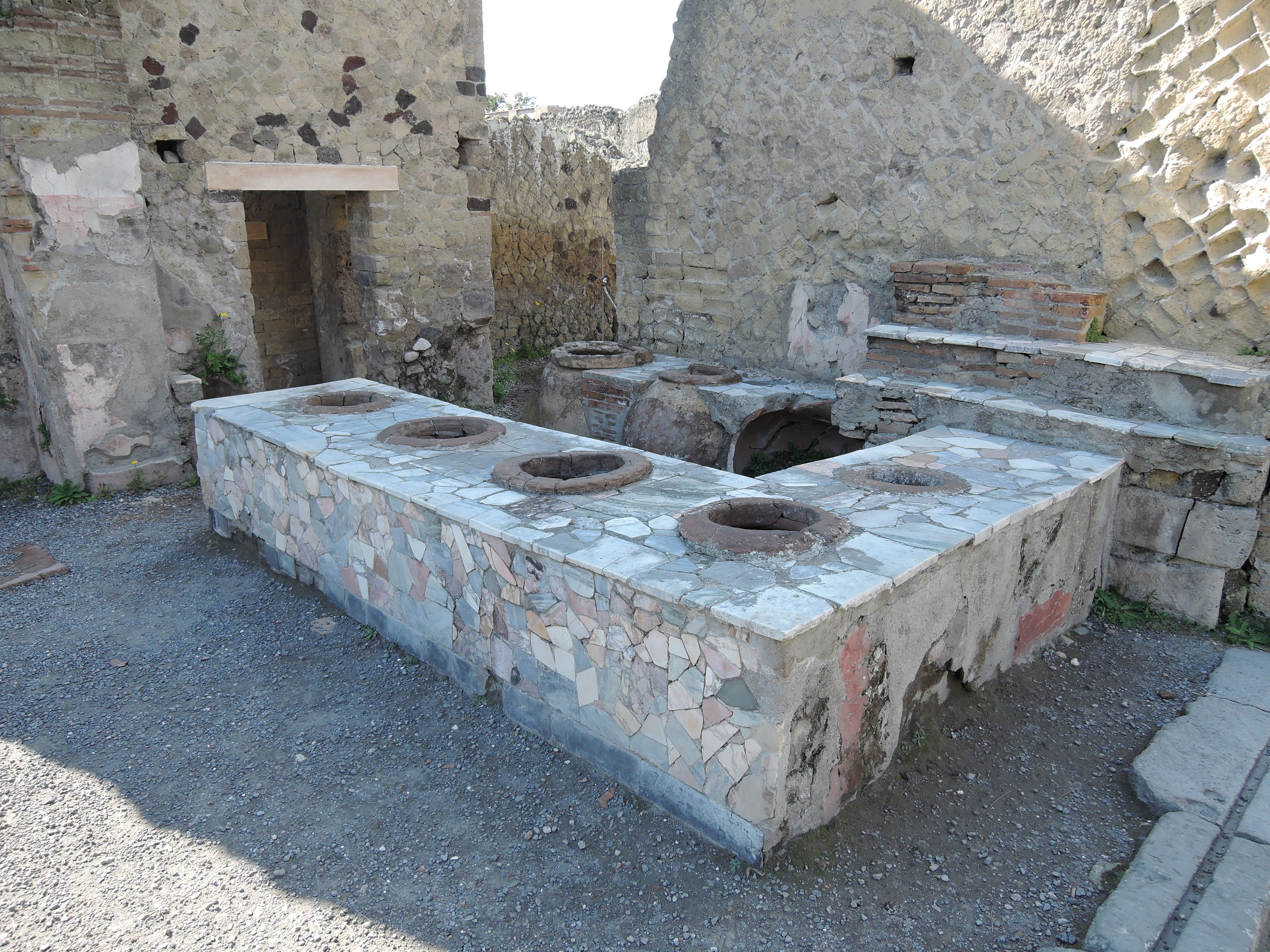 Die nächste Station waren dann das Grabungsgelände von Herculaneum (Savi di Ercolano). Als der Vesuv im Jahre 79 n. Chr. ausbrach, bedeckte die Lava das am Berg gelegene Dorf. Durch Ausgrabungen wurden Teile wieder freigelegt, die durch die Zuschüttung erstaunlich gut erhalten sind. Die antiken Räumlichkeiten, von Wohnhäusern, Thermen und Verkaufsläden bis zu Priesterstätten, konnten wir tatsächlich wiedererkennen. Viele Einzeilheiten, wie Mosaikböden und Wandfresken, haben die Zeit überdauert. Vor allem ein Mosaik von Neptun und Amphitrite und ein Relief von Thelephos haben fast keinen Schaden genommen.