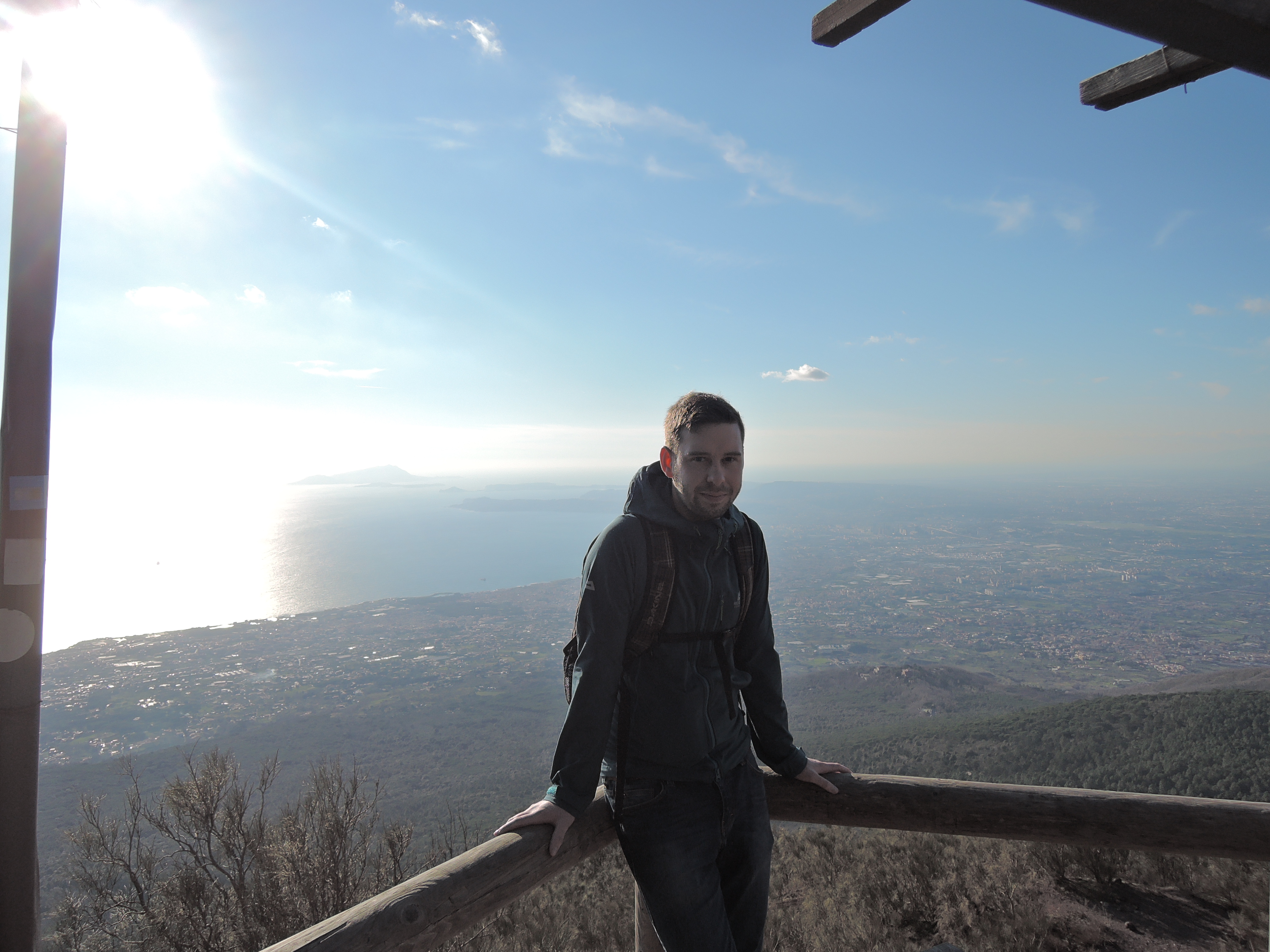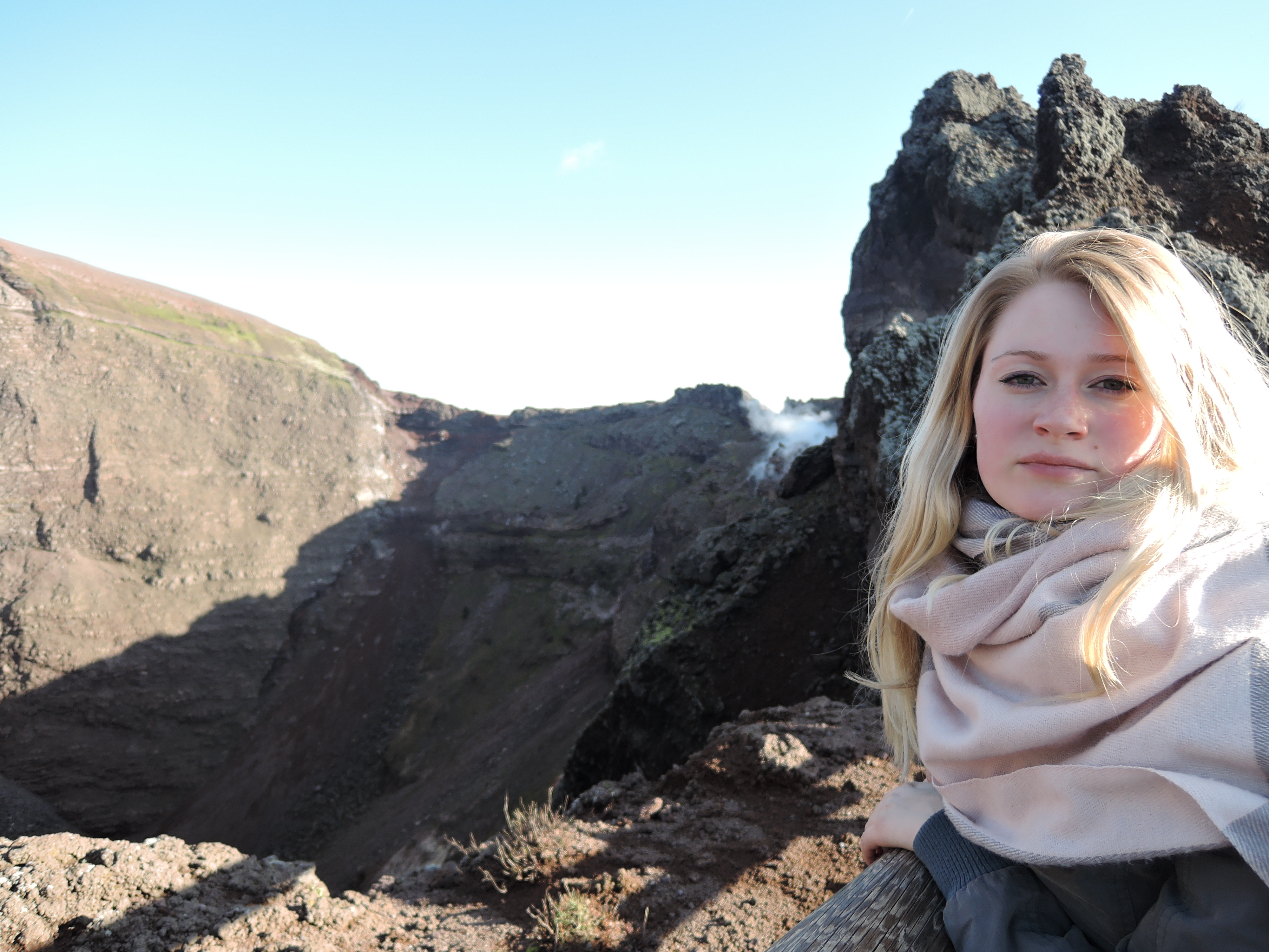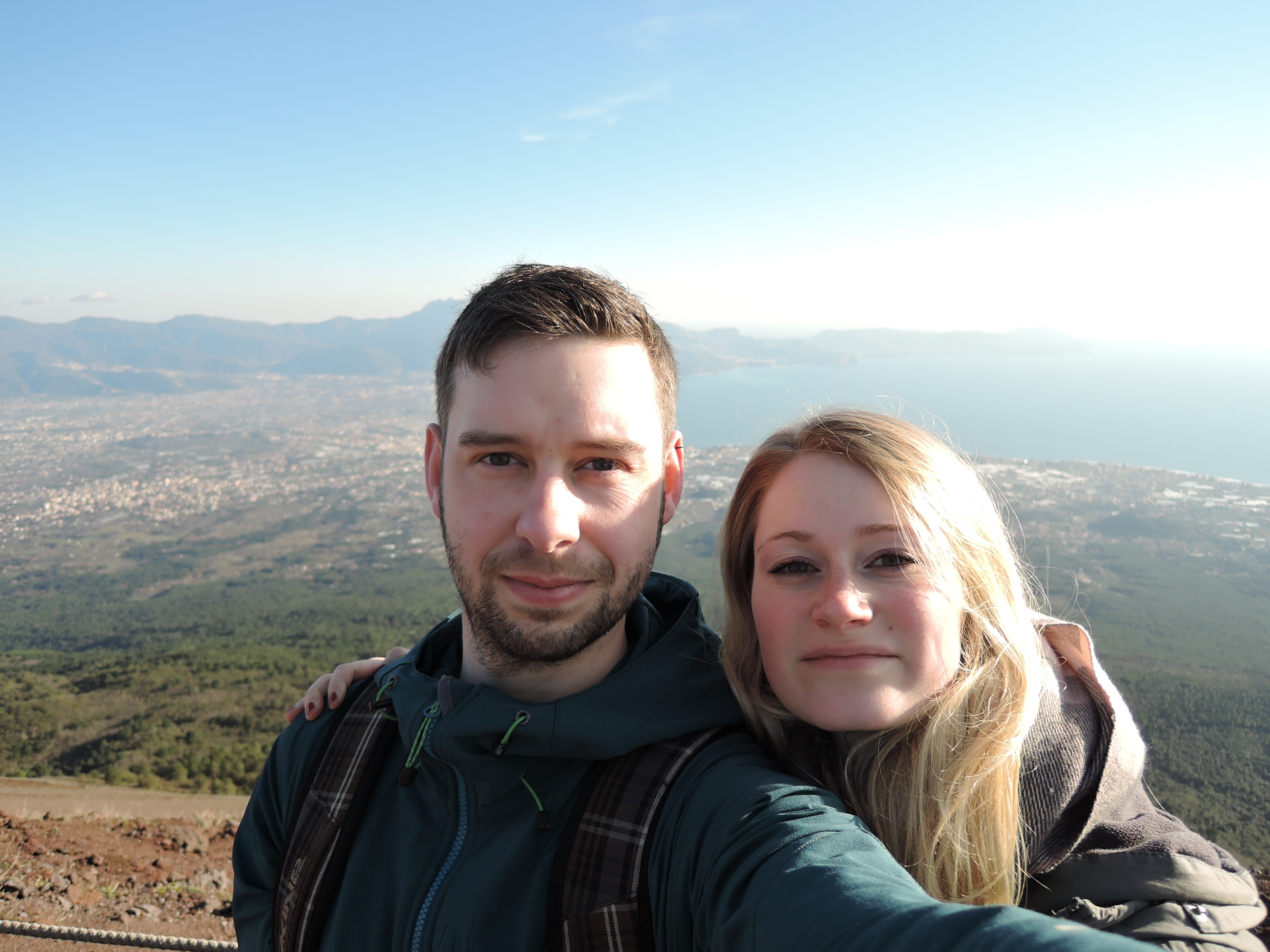 Nach den Ausgrabungen haben wir zufällig den letzten Bus zum Vesuv erwischt. Er war leider ziemlich teuer, aber den 1281m hohen Vulkan wollten wir dann doch nicht zu Fuß erklimmen. 🙂 Nach einer kurvigen Fahrt erreichten wir den „Eingang“ zum Vesuv, von dem wir dann allerdings noch einige Meter hoch zum Krater zu Fuß heraufsteigen mussten. Der Krater hat einen Durchmesser von 600m und ist 200m tief. Wir konnten sogar kleine Schwefelwolken ausmachen. Der Blick von dort oben über den Golf von Neapel war wirklich atemberaubend. Leider war es gegen 15h schon leicht diesig, weswegen die Aussicht ein wenig eingeschränkt war. Von den am Boden herrschenden 14 Grad waren oben nur noch 8 Grad und viel Wind übrig. Dennoch war der Ausflug dorthin ein echtes Highlight.
