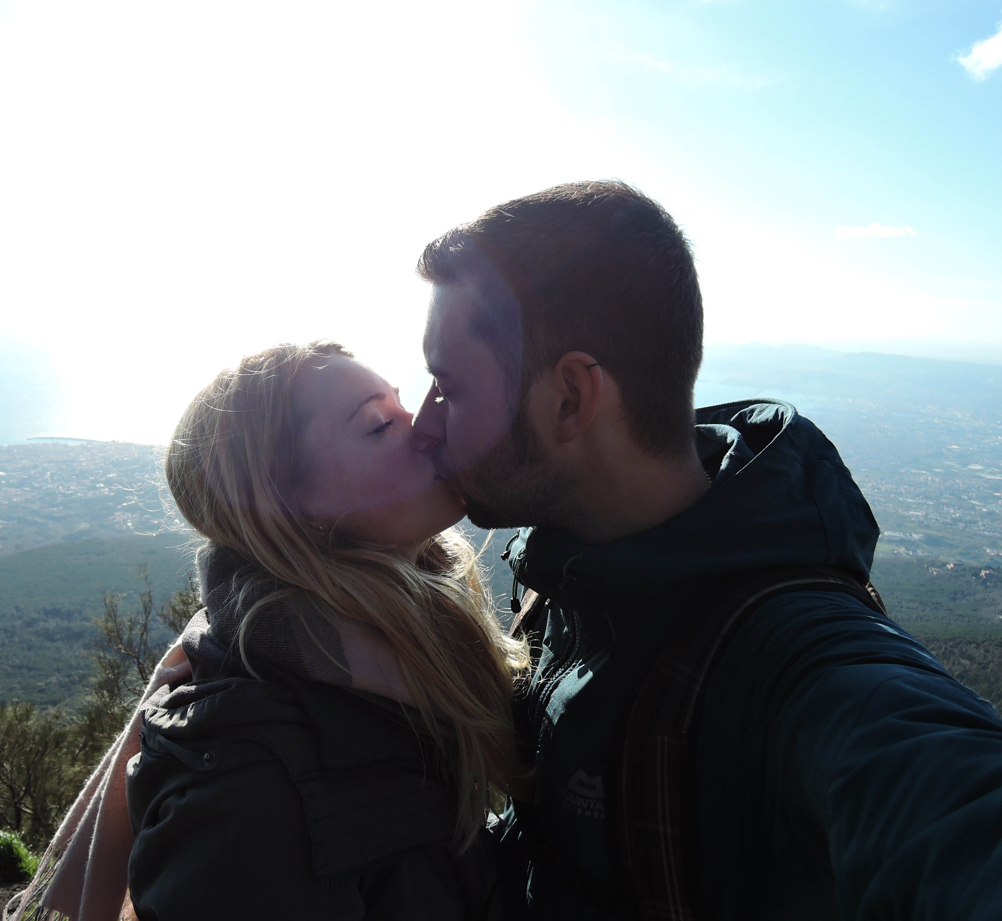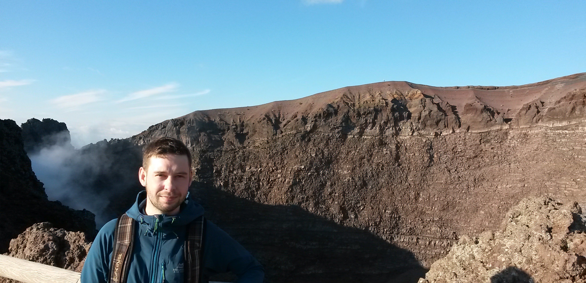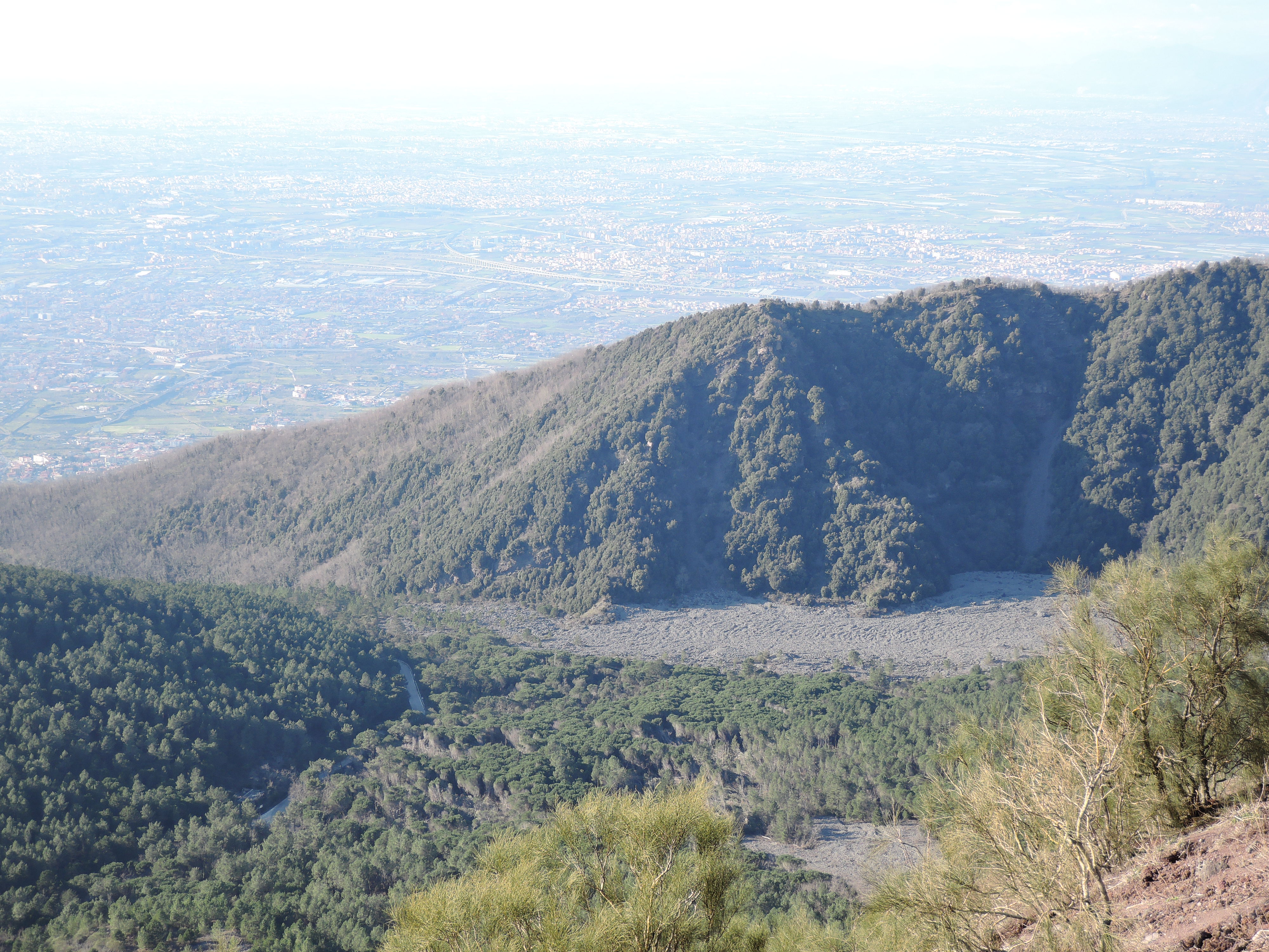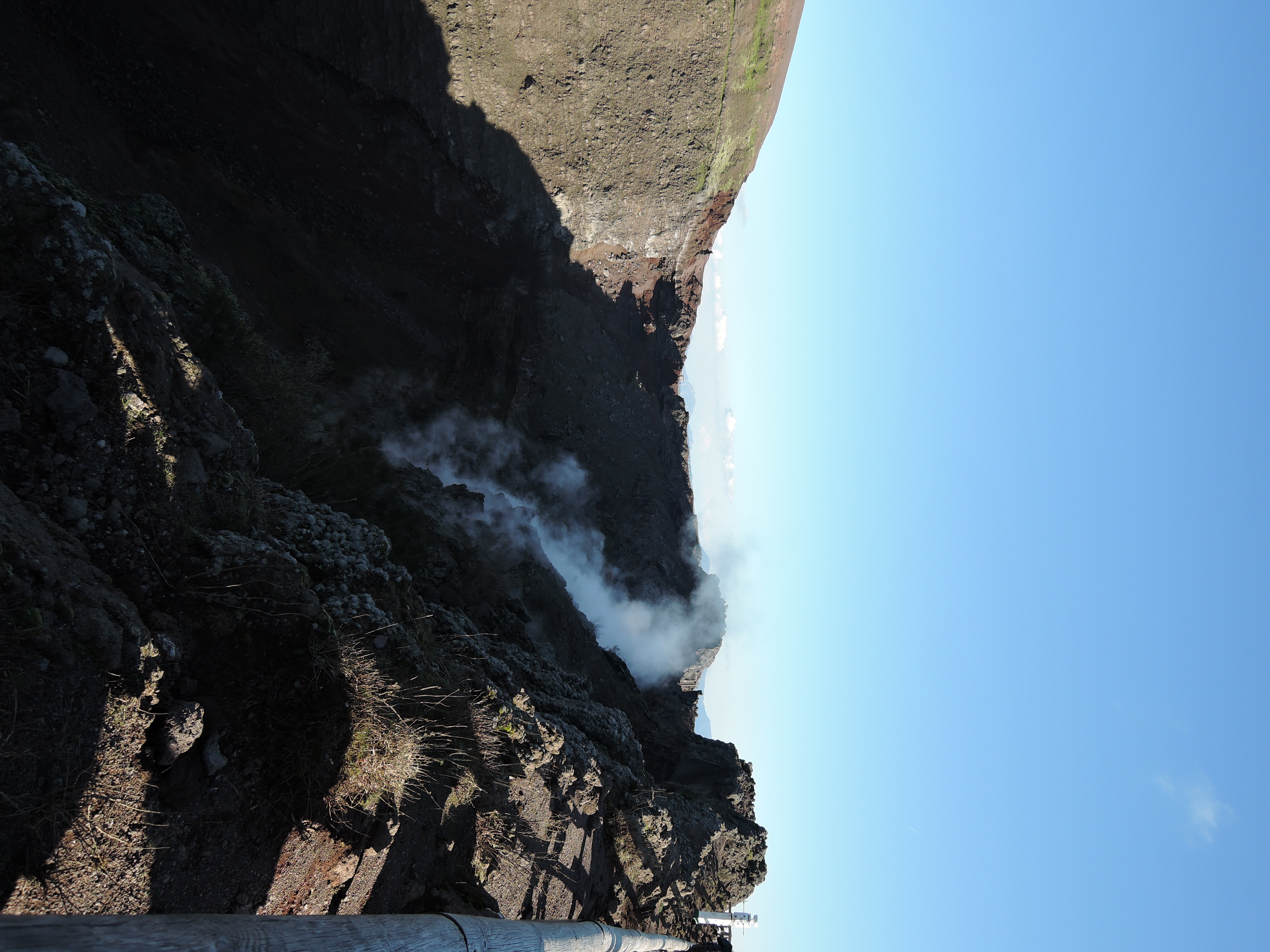 Nach den Ausgrabungen haben wir zufällig den letzten Bus zum Vesuv erwischt. Er war leider ziemlich teuer, aber den 1281m hohen Vulkan wollten wir dann doch nicht zu Fuß erklimmen. 🙂 Nach einer kurvigen Fahrt erreichten wir den „Eingang“ zum Vesuv, von dem wir dann allerdings noch einige Meter hoch zum Krater zu Fuß heraufsteigen mussten. Der Krater hat einen Durchmesser von 600m und ist 200m tief. Wir konnten sogar kleine Schwefelwolken ausmachen. Der Blick von dort oben über den Golf von Neapel war wirklich atemberaubend. Leider war es gegen 15h schon leicht diesig, weswegen die Aussicht ein wenig eingeschränkt war. Von den am Boden herrschenden 14 Grad waren oben nur noch 8 Grad und viel Wind übrig. Dennoch war der Ausflug dorthin ein echtes Highlight.