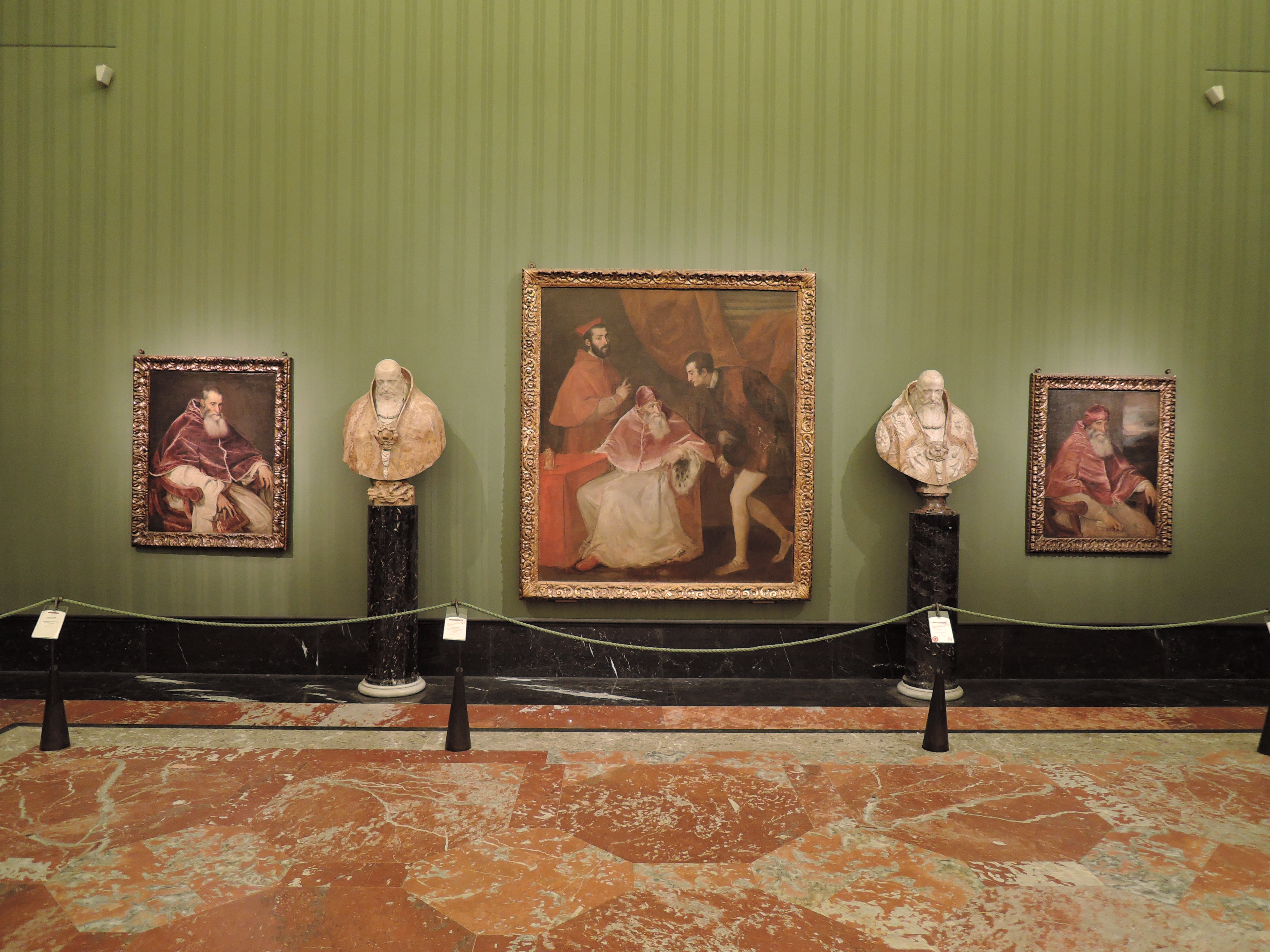 In der Mitte: Tizians "Papst Paul III. und seine Neffen Alessandro und Ottavio Farnese" von 1546