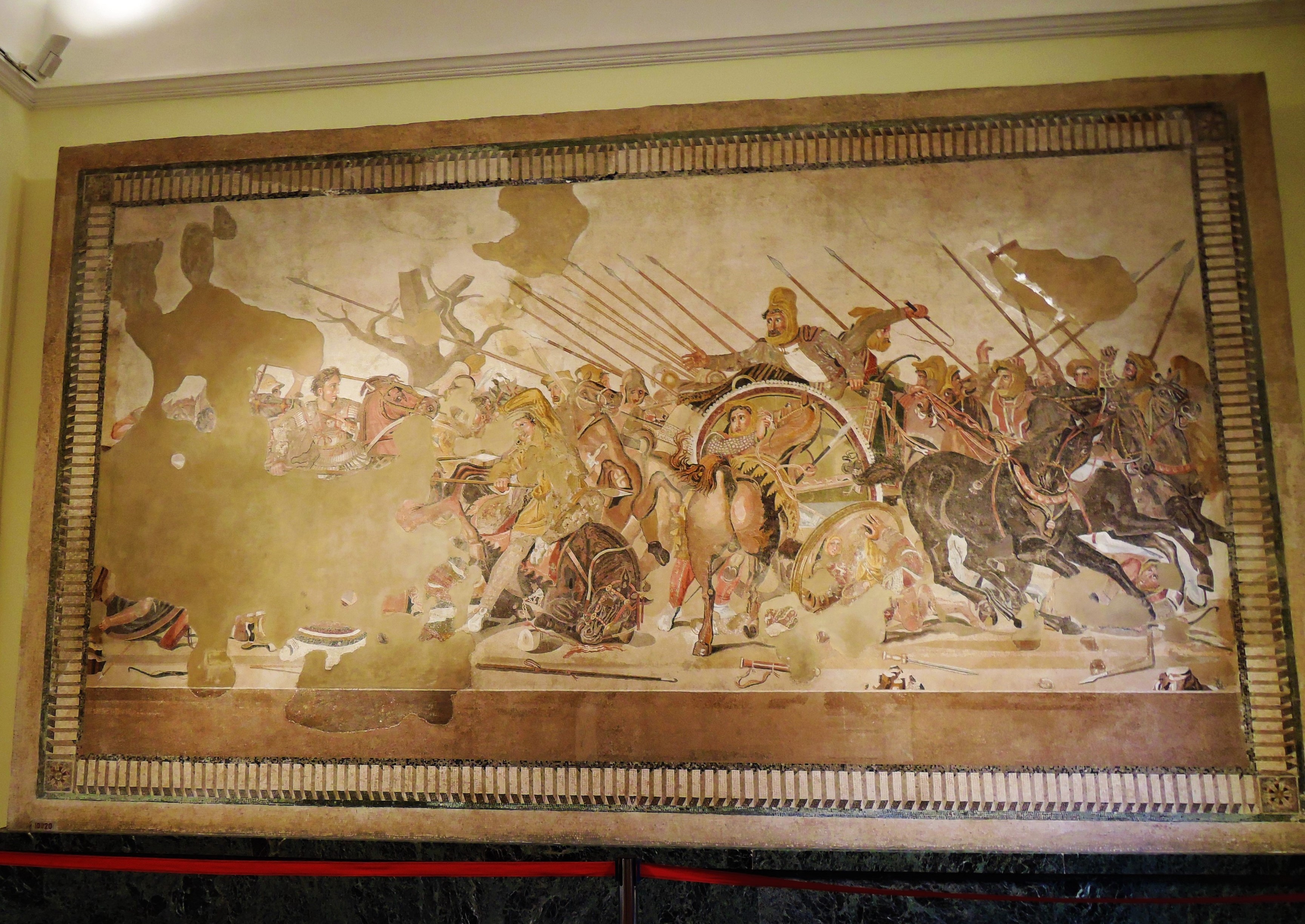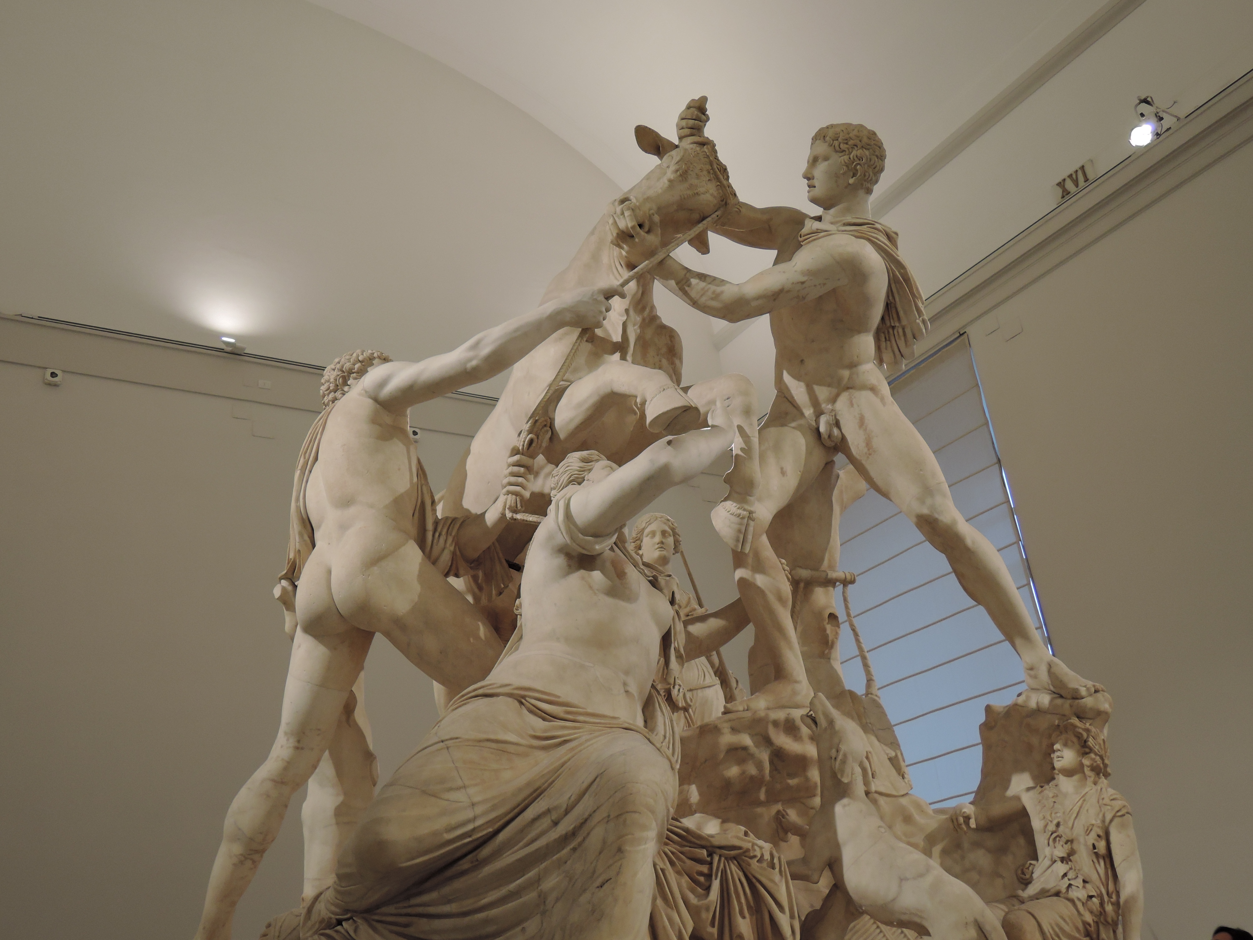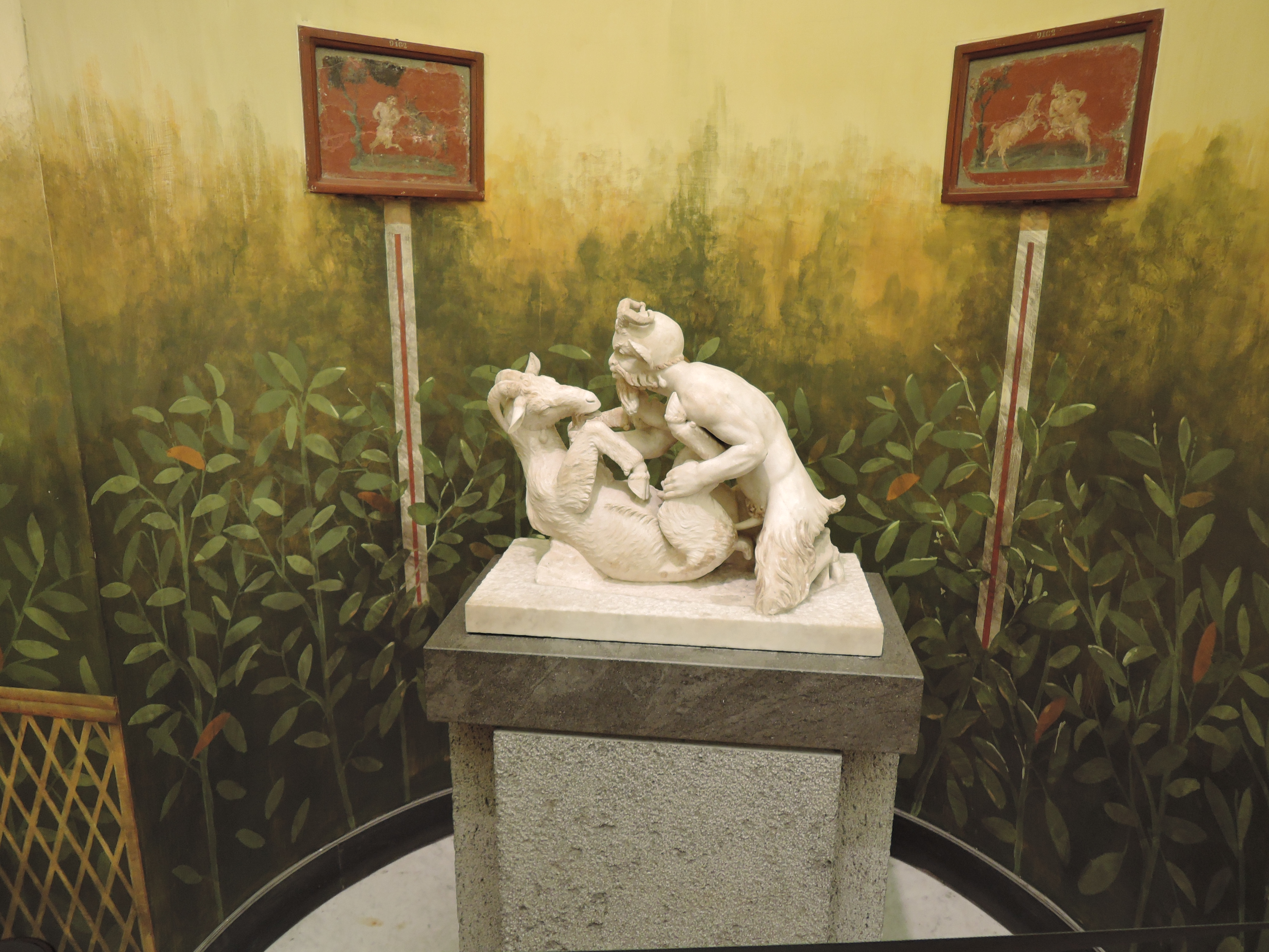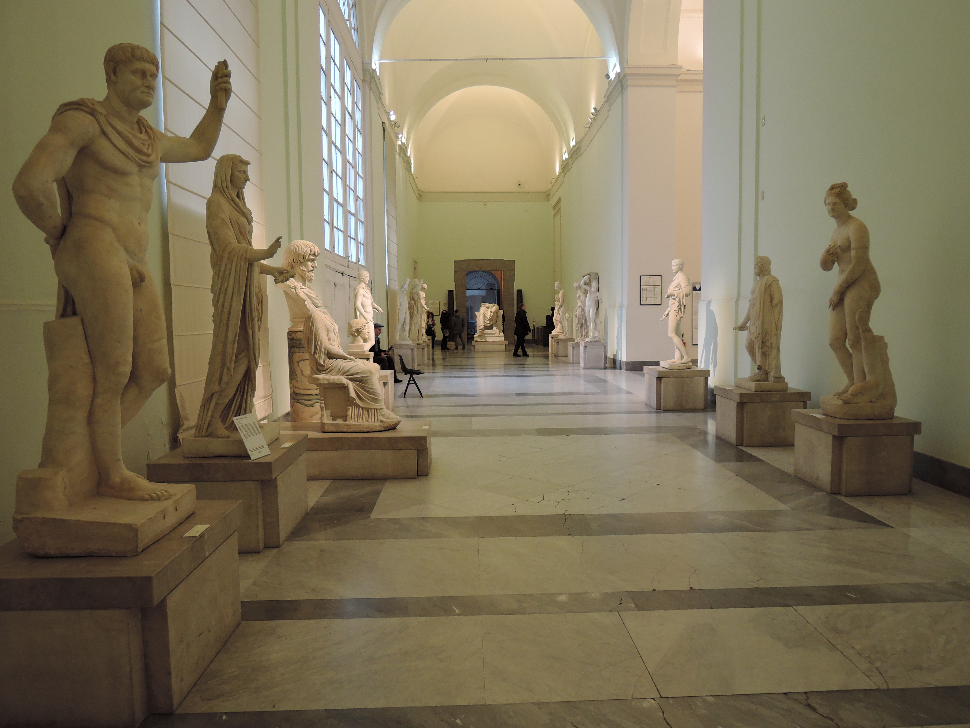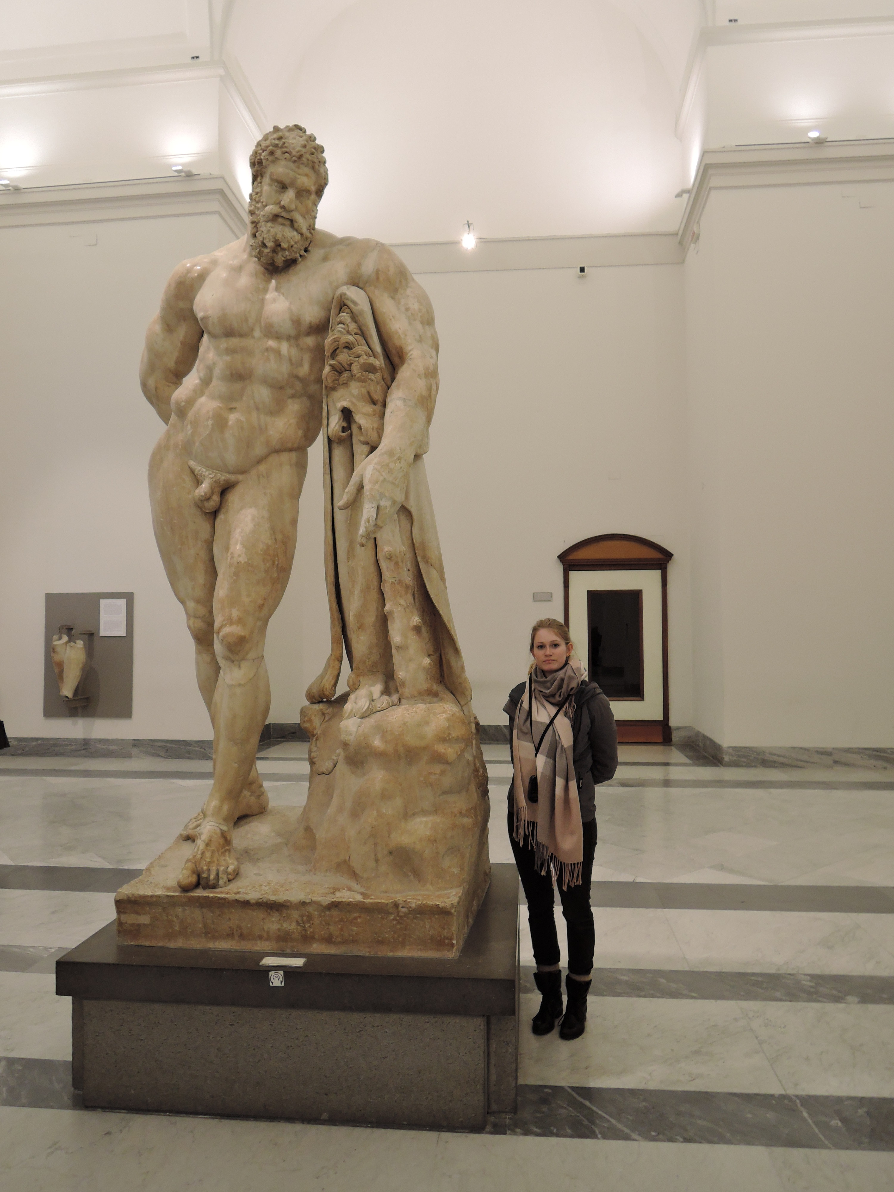 Nach dem Essen machten wir uns auf den Weg zum Archäologischen Nationalmuseum, das direkt um die Ecke liegt. Hier nahmen wir uns einen deutschen Audioguide. Dieser wählte gezielt nur die „besonderen“ Werke der Antikensammlung, die sich dort befindet, aus. Uns beeindruckte vor allem die Herkules-Statue, die zu dem klassichen Antikenkanon gehört. Auch der Farnesische Stier, der aus nur einem Marmorblock gefertigt wurde, hat uns sehr gefallen. Außerdem konnten wir uns viele Mosaike und Glasgegenstände ansehen, die in Pompeji und Herkulaneum ausgegraben wurden, ansehen. Das berühmte Alexandermosaik aus über 1 Mio. Mosaiksteinchen war besonders beeindruckend. Leider waren viele Bereiche der Sammlung geschlossen, sodass wir u.a. den Atlas Farnese nicht gesehen haben. Zu den geöffneten Teilen gehörte das Geheimkabinett, welches Wandmalereien, Statuetten und Mosaike aus Freudenhäusern des antiken Pompejis. Erst 1967 wurde sie der Öffentlichkeit zugänglich gemacht. Vorher wurde sie zwar im Museum untergebracht, aber durch zugemauerte Wände abgeriegelt, da sie zu anzüglich gewesen sei. Tatsächlich entdeckten wir dort ganz andere Darstellungsmotive als in der restlichen Sammlung. 🙂