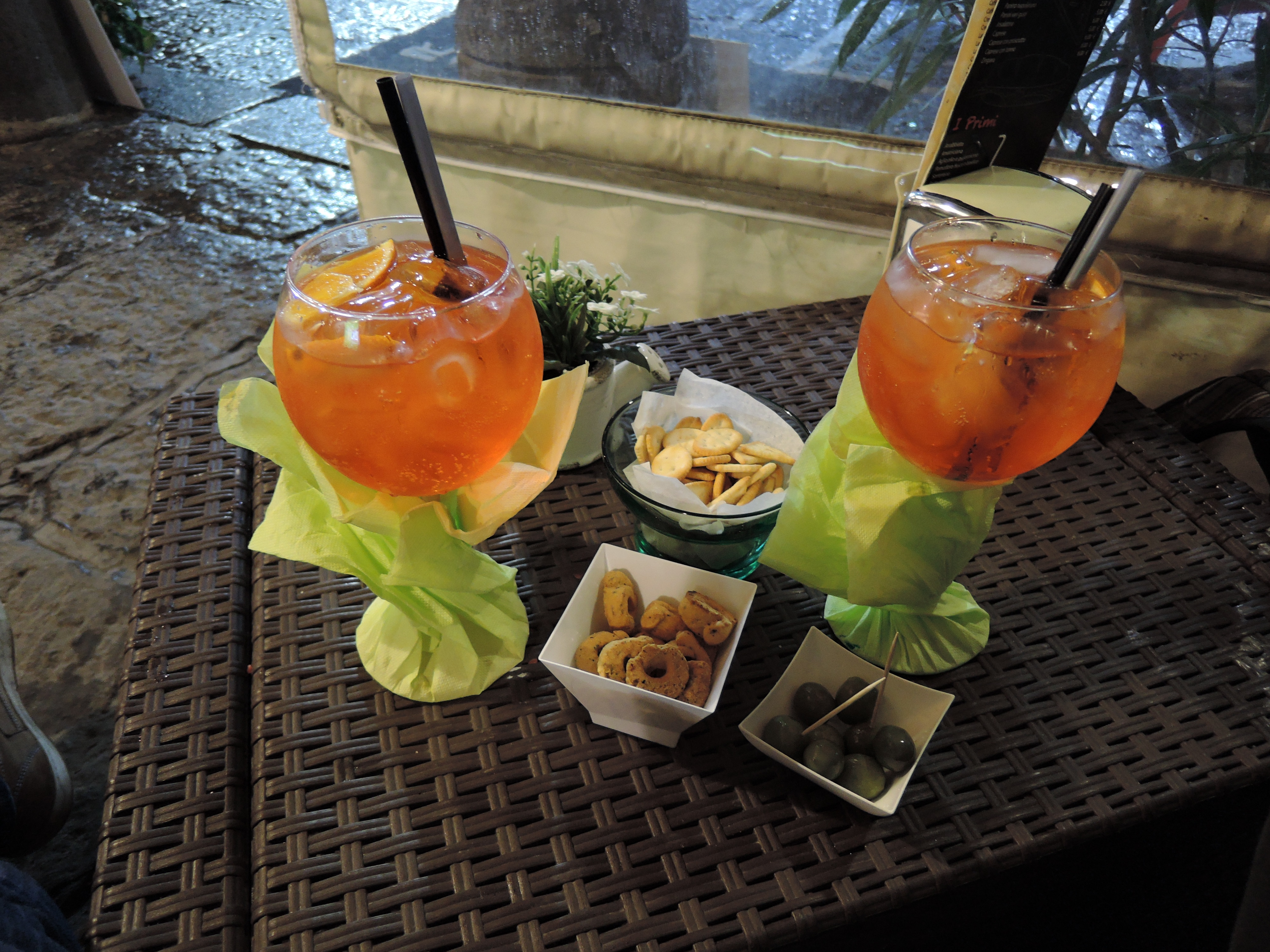 Bis sieben Uhr hielten wir uns in dem Museum auf. Als wir es verließen, war es bereits dunkel und wir gingen in unsere Straße zurück. Dabei kamen wir an einer Bar vorbei, an der wir noch einen Zwischenstopp einlegten. Tatsächlich bekamen wir zu dem Aperol Spritz wieder leckeres Gebäck und Oliven dazu, ohne es bezahlen zu müssen.
